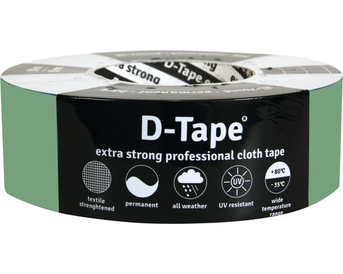 Gemaakt van een zeer sterke linnen backing met een hoogwaardige polyethyleen coating. Daardoor is D-Tape® olie- en waterbestendig en bijzonder geschikt voor noodreparaties en allerlei permanente verbindingen. Deze zachte en soepele tape is in de lengterichting bijzonder sterk terwijl het in de breedterichting gemakkelijk af te scheuren is. D-Tape® is weer- en UV-bestendig en kan tegen zeer lage – en hoge temperaturen. Deze rol betreft een kwaliteit voor permanent gebruik. D-Tape® heeft een lage aanvangskleefkracht maar blijft uitermate goed zitten.